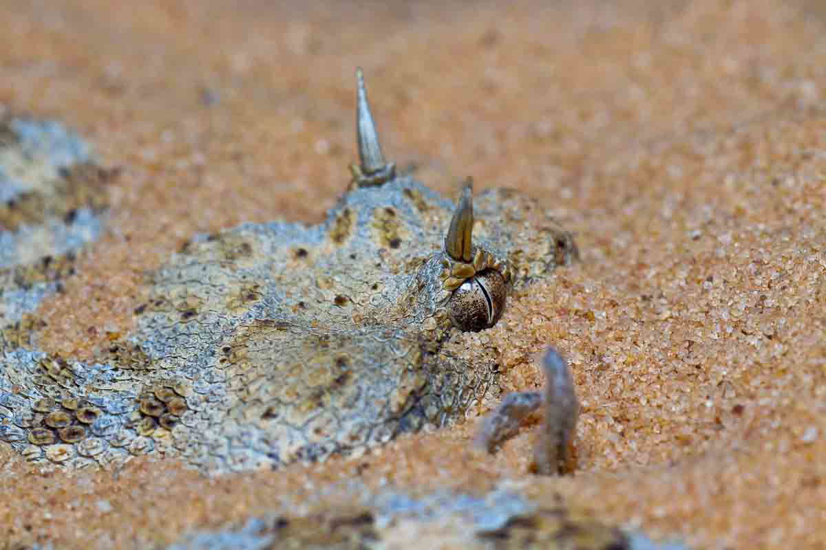 תיאור הנחש : צבעו הכללי אפור עם כתמים כחלחלים וחומים, זוג קרניים עשויות קשקש בודד בכל צד מעל מגן העין.